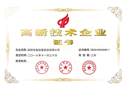美佳愛科技高新技術(shù)企業(yè)認(rèn)證證書